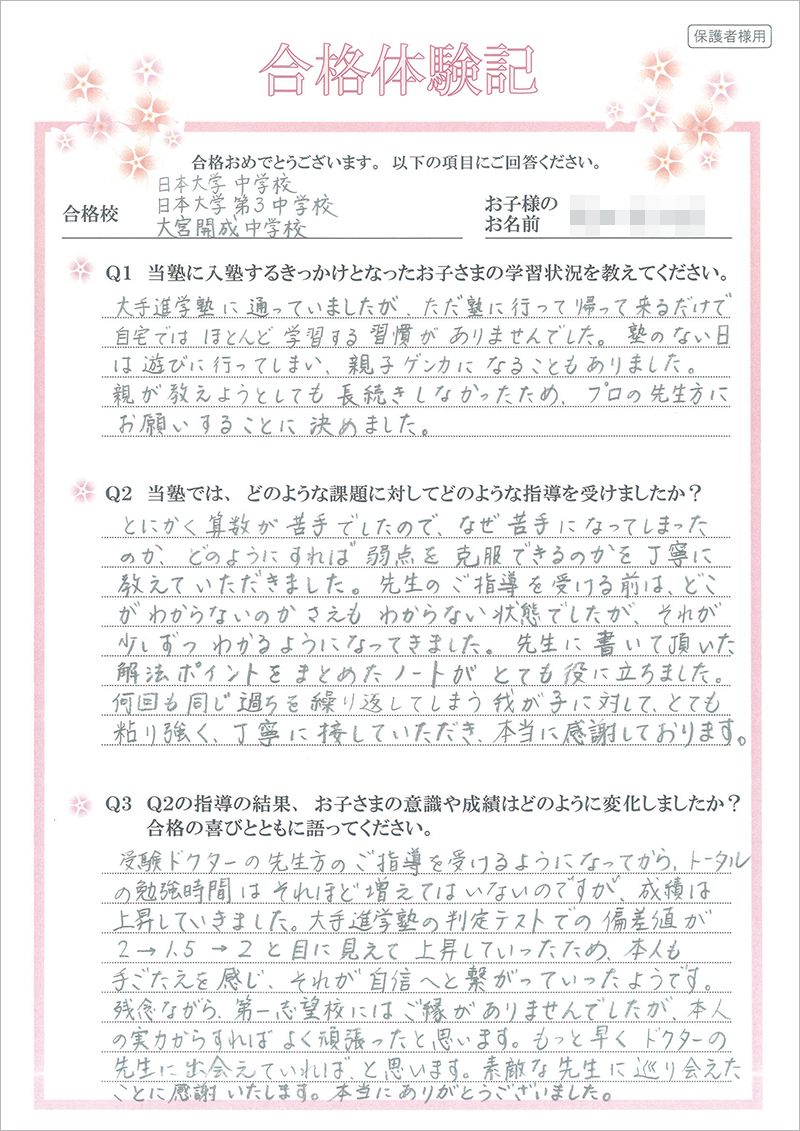 残念ながら、第一志望校にはご縁がありませんでしたが、本人の実力からすれば、よく頑張ったと思います。もっと早くドクターの先生に出会えていれば、と思います。素敵な先生に巡り会えたことに感謝いたします。本当にありがとうございました。