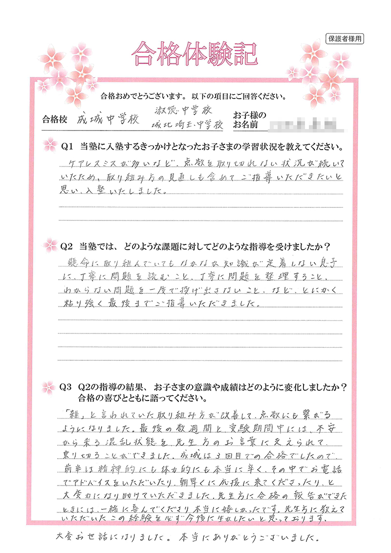 「雑」と言われていた取り組み方が改善して、点数にも繋がるようになりました。最後の数週間と受験期間中には、不安からくる混乱状態を先生方のお言葉に支えられて、乗り切ることができました。成城は3回目での合格でしたので、前半は精神的にも体力的にも本当に辛く、その中でお電話でアドバイスをいただいたり、朝早く応援に来てくださったり、と大変力になり、助けていただきました。先生方に合格の報告ができたときには、一緒に喜んでくださったり、本当に嬉しかったです。先生方に教えていただいたこの経験を必ず今後に生かしたいと思っております。大変お世話になりました。本当にありがとうございました。