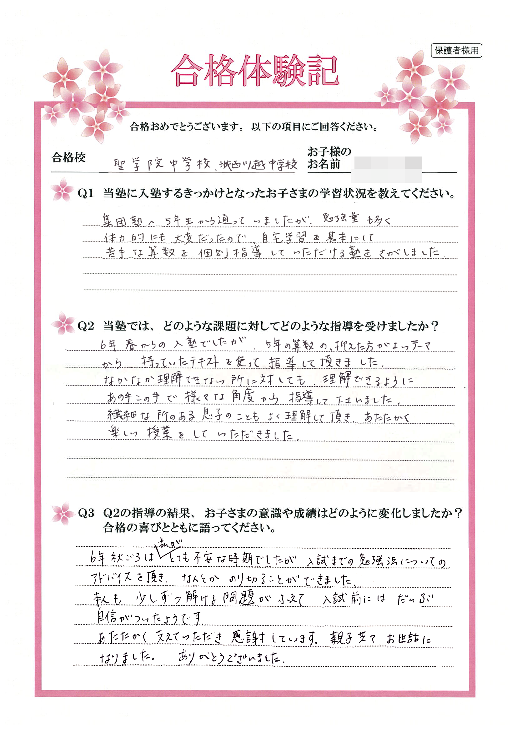 6年秋ごろは私がとても不安な時期でしたが入試までの勉強法についてのアドバイスを頂き、なんとかのり切ることができました。本人も少しずつ解ける問題がふえて入試前にはだいぶ自信がついたようです。あたたかく支えていただき感射しています。親子共々お世話になりました。ありがとうございました。