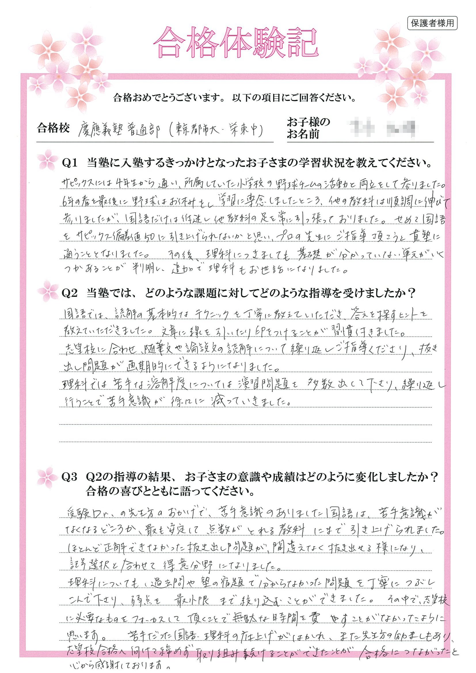 サピックスには4年生から通い、所属していた小学校の野球チームの活動と両立をして参りました。6年の春を最後に野球はお休みをし学習に専念しましたところ、他の教科は順調に伸びて参りましたが、国語だけは低迷し他教科の足を常に引っ張っておりました。せめて国語をサピックス偏差値50に引き上げられないかと思い、プロの先生にご指導頂こうと貴塾に通うこととなりました。その後、理科につきましても基礎が分かっていない単元がいくつかあることが判明し、追加で理科もお世話になりました。