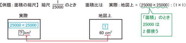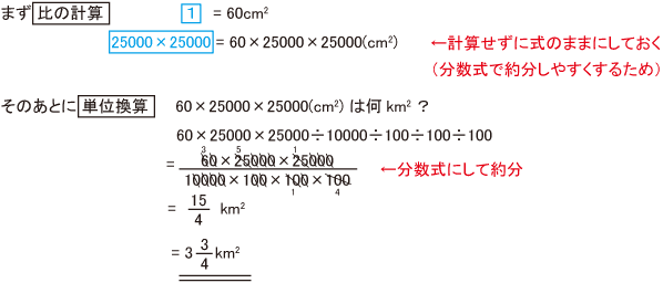 ※ 縮尺の問題では「単位換算」と「比の計算(縮尺の計算)」の2つの計算を行わなければならない。縮尺が苦手になる原因はここ。計算する順番をしっかりおさえること。
