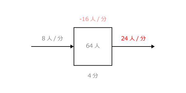 そう、8人ずつ行列に加わっているにもかかわらず、16人減るのですから、1つの入口では、8+16=24人/分ずつ「出荷」していることになりますね。