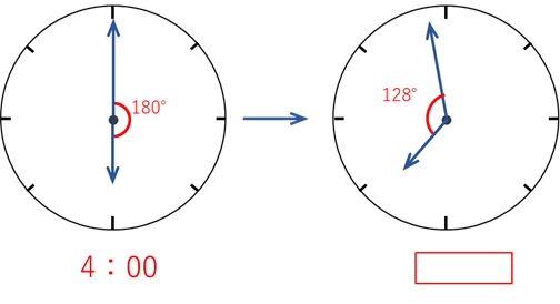 4時16分の次に角度が128°になるのは、下の図のような時です。この時刻を求めて、4時16分の何分後になるかを答えればよいのです。