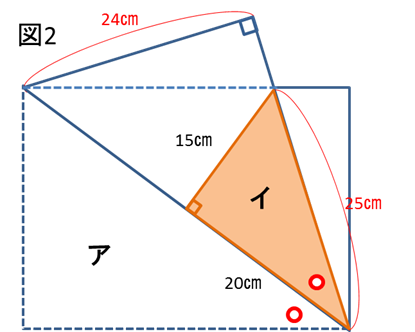 長方形の対角線は40cmでしたので、その半分が20cmであることを利用して、アの3辺の比をそのままイに適用すると、辺の長さが図のように求まります。
