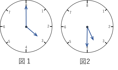 ある星では、1日が8時間で、1時間が40分です。この星の時計は次の図のようになっており、例えば、図1は3時ちょうど、図2は3時20分を表しています。下の問いに答えなさい。