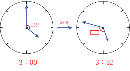 (1)3時32分のとき、長針と短針が作る角のうち、小さい方の角の大きさは何度ですか。