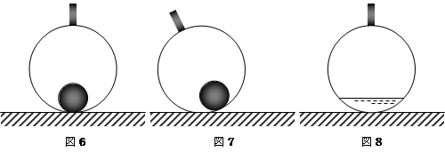 問4 図6のおもりを取り除き,図8のように水を少し入れました。問3と同じように球を傾けていったん止めてから,静かに離すと球はどうなりますか。