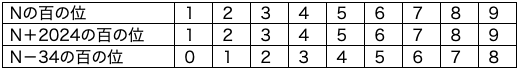 百の位が1~9のときにN+2024、N-34の百のくらいがいくつになるのかを