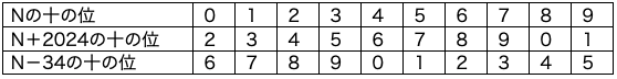 十の位が0~9のときにN+2024、N-34の十の位がいくつになるのかを