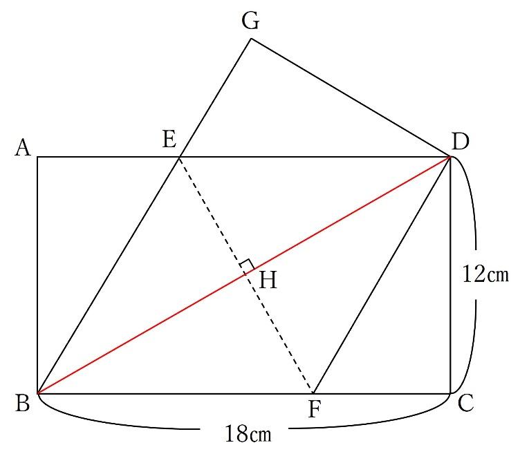 下の図のような長方形ABCDがあります。この長方形を、点Bと点Dが重なるよう、EFを折り目にして折り返します。
