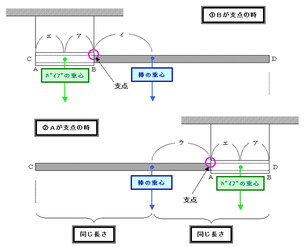 となり、金属パイプと棒の重心は、①と②とで、重さと位置は変わりませんので、