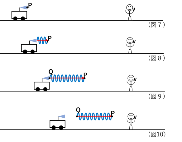 ここで、図5の音Pが図6の音Pまで進んでいる時間が観測者の音を聞いている時間になるので、
