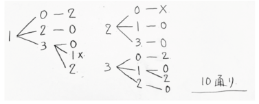 しかし、このように書いていくと、数の少ないうちはまだいいのですが、数字が増えて行くに従って、樹形図が上下に広がるので、「あ、これ抜けてた」というようなものを追加で書こうとすると、字が小さくなって無理やり詰め込むような形で書いたり、そしてそれが原因となって数え間違いを起こしやすくなります。
