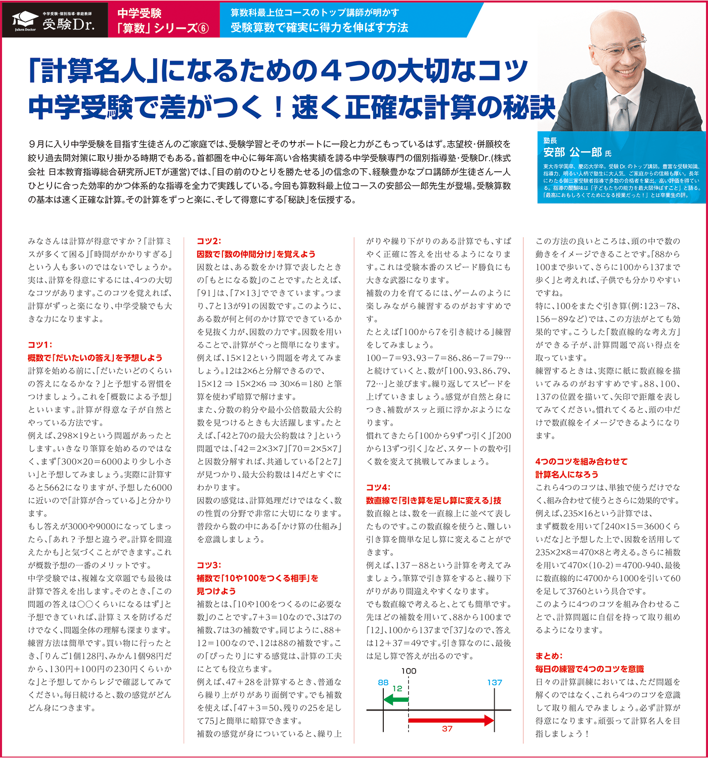 9月15日掲載の第21回では、計算が得意になるための4つのコツについて安部 公一郎先生が説明しています。