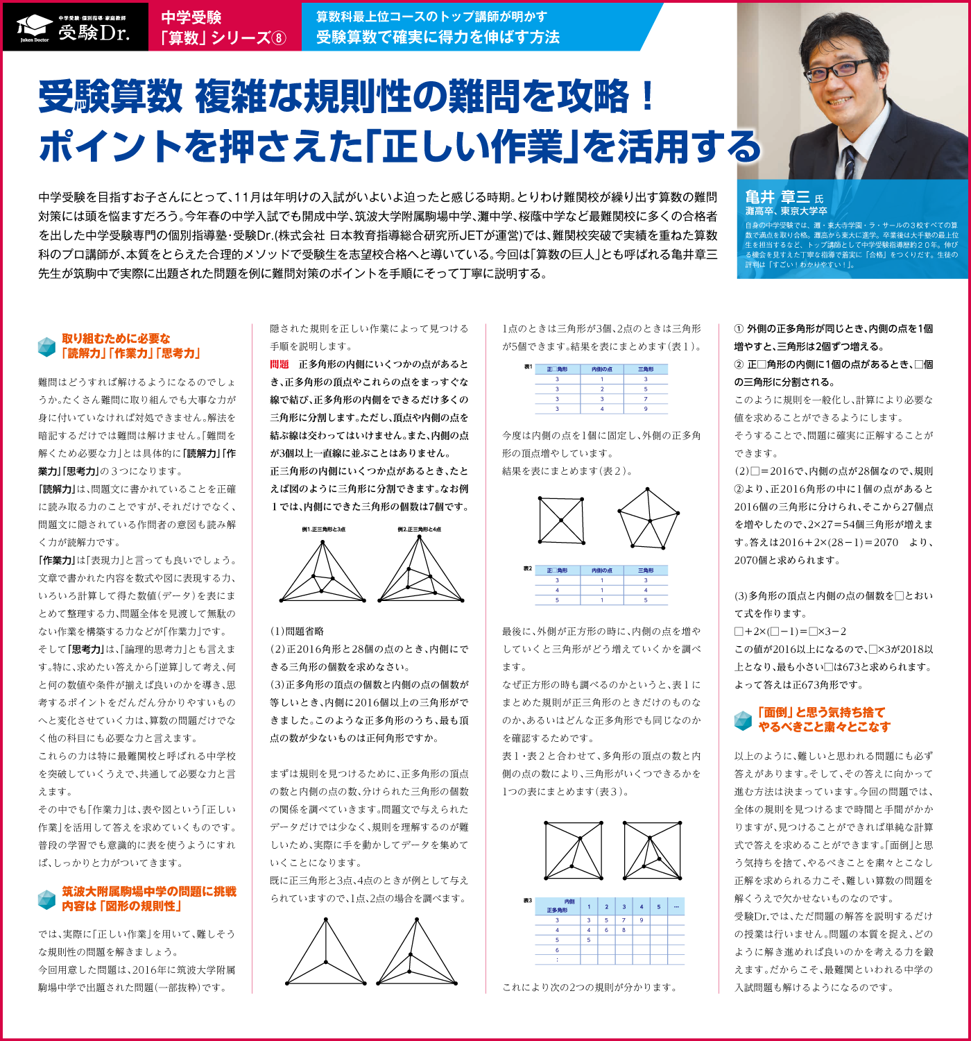 11月8日掲載の第23回では、規則性の難問を解くときのコツについて亀井 章三先生が説明しています。