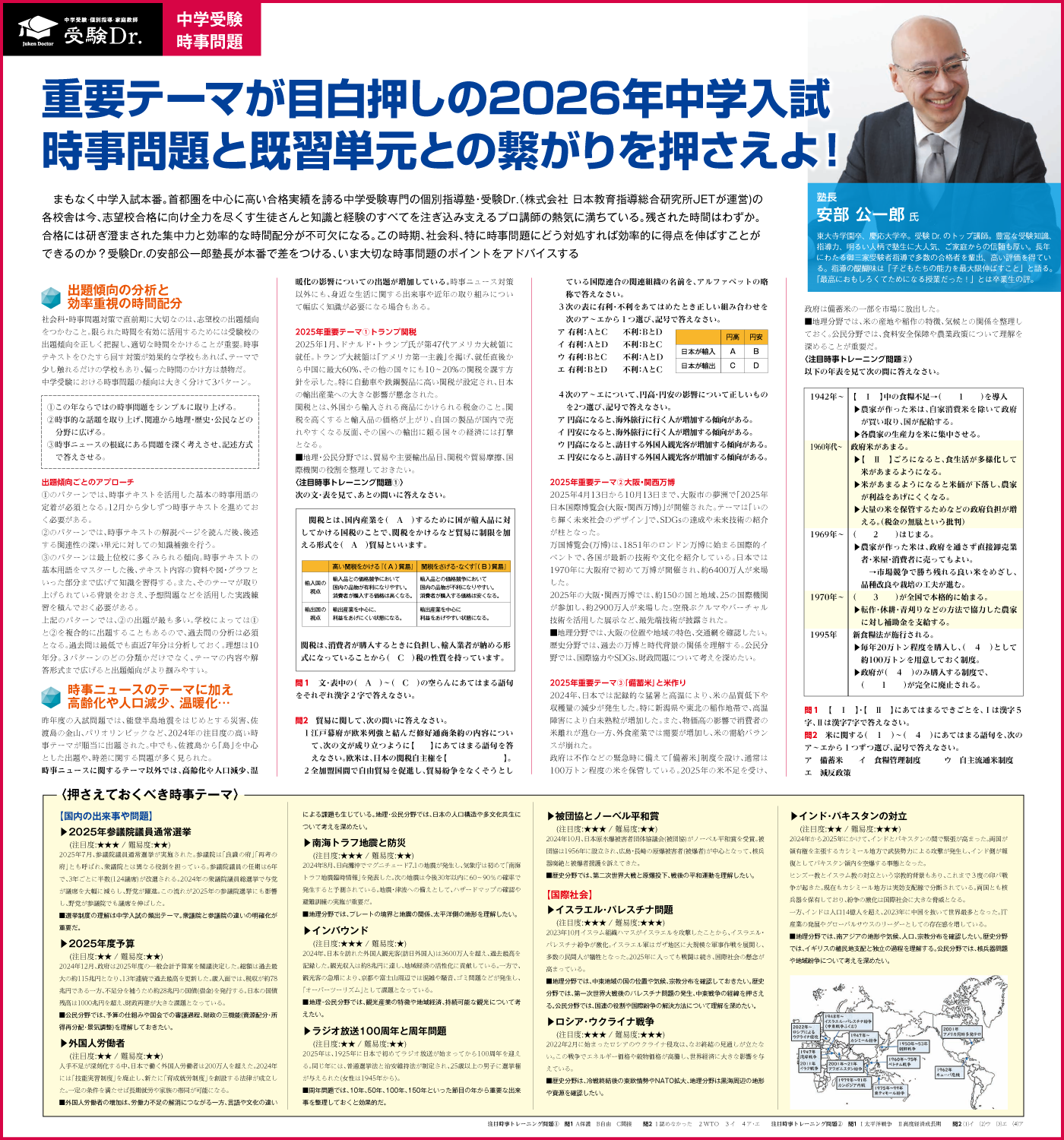 12月1日掲載の第13回では、2025年度入試で注目の時事テーマと時事問題の攻略について、安部 公一郎先生が説明しています。
