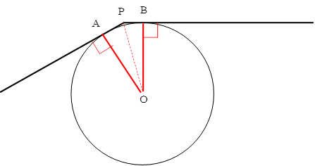 円が直線と接する(1点で交わる)とき、直線と円の半径は垂直になります。その結果、△OPAと△OPBは合同になります。(なぜなら、OA=OB、角OAP=角OBP=直角、OP共通)